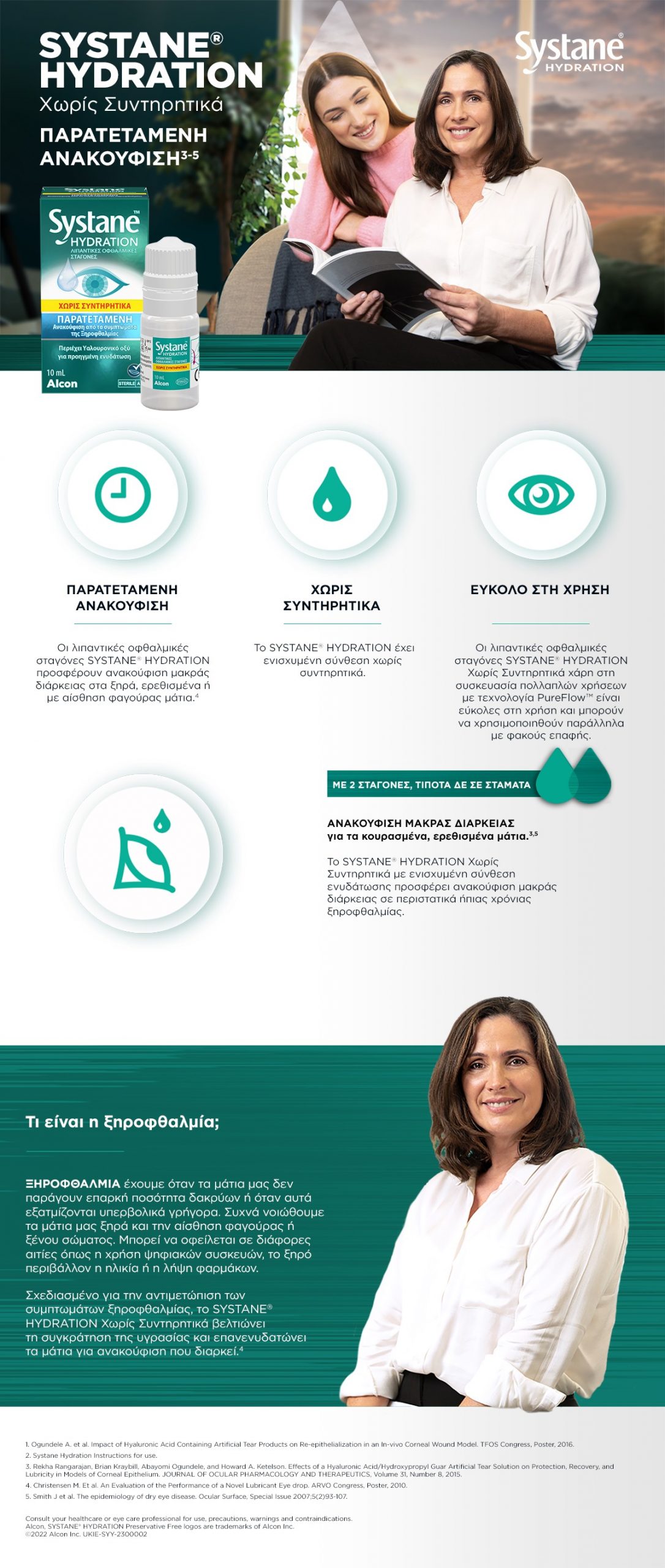 ΠΕΡΙΓΡΑΦΗ Οφθαλμικές σταγόνες Systane HYDRATION Ενυδατικές οφθαλμικές σταγόνες Systane®HYDRATION απο την εταιρεία Alcon με δύο πολυμερή που λειτουργούν ως «επίδεσμος» και επιτρέπουν την αναγέννηση των κατεστραμμένων κυττάρων στην επιφάνεια του ματιού – με μακροπρόθεσμη προστασία και μεγαλύτερη ενυδάτωση από το υαλουρονικό οξύ, όταν υπάρχει μόνο του. Ο συνδυασμός της ΗΡ-guar και του υαλουρονικού οξέος συνδέεται επί των κατεστραμμένων κυττάρων στο επιθήλιο του κερατοειδούς και συλλαμβάνει, η οποία αυξάνει την ενυδάτωση και τη λίπανση. Τόσο η ενυδάτωση όσο και η λίπανση είναι πολύ σημαντικά για την προστασία της επιφάνειας των ματιών. Εκτός απο τη μεγαλύτερη προστασία του ματιού οι σταγόνες Systane®HYDRATION επίσης να επιτρέπουν την ανάκτηση της επιφάνειας του ματιού. Χρήση Οι ενυδατικές οφθαλμικές σταγόνες Systane®HYDRATION επίσης να ανακουφίζουν από τα συμπτώματα της ξηροφθαλμίας και παρέχουν προσωρινή ανακούφιση από την καύση και την ενόχληση που προκαλείται από την ξηροφθαλμία. Μπορούν να χρησιμοποιηθούν καθημερινά για ενυδάτωση και λίπανση κατά τη διάρκεια συνεχούς ή μιας χρήσης σιλικόνης-υδρογέλης και μαλακούς (υδρόφιλους) φακούς επαφής. Μπορούν να χρησιμοποιηθούν έως και 3 μήνες μετά το άνοιγμα. Τα ξηρά ή κόκκινα μάτια σας ενοχλούν; Οι οφθαλμικές σταγόνες Systane®HYDRATION 10ml βοηθούν εναντίον του επονομαζόμενου σύνδρομου ξηροφθαλμίας. Είναι ιδανική προσθήκη για τη λίπανση των φακών επαφής, ιδιαίτερα σε θυελλώδεις, χαμηλές θερμοκρασίες και σε χώρους με σκόνη και ξηρές συνθήκες. Ρίχνουμε στο μάτι τις σταγόνες αργά και προσεκτικά κάθε φορά που έχουμε δυσάρεστο ή ενοχλητικό αίσθημα στα μάτια μας. Περισσότερες Οφθαλμικές σταγόνες και Σπρέι.